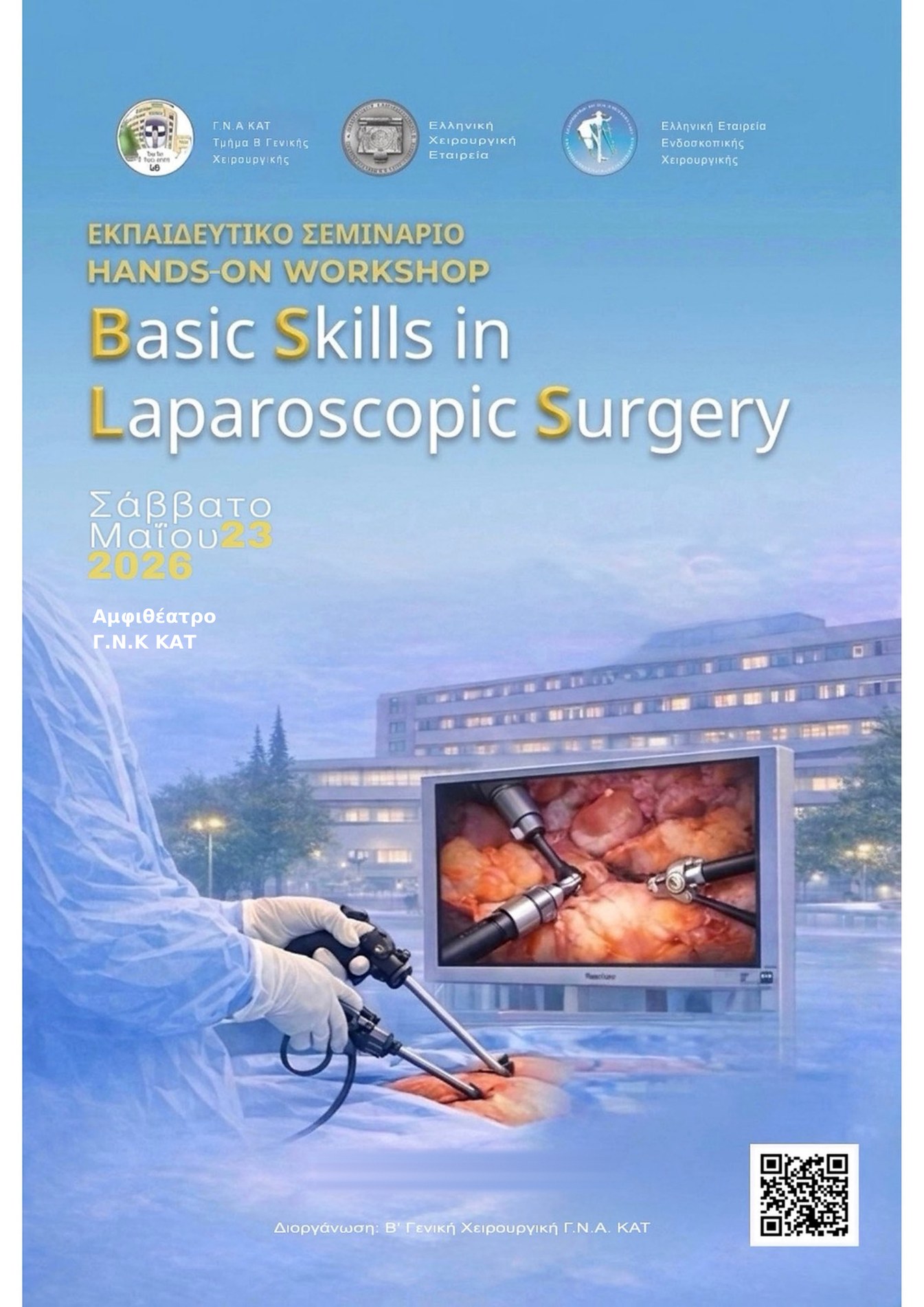 Με μεγάλη χαρά σας προσκαλούμε στο Εκπαιδευτικό Σεμινάριο (hands-on workshop) “Basic Skills in Laparoscopic Surgery” που θα πραγματοποιηθεί στις 23 Μαΐου 2026 στο αμφιθέατρο του Γ.Ν.Α. ΚΑΤ. Η συνάντηση αυτή διοργανώνεται από το τμήμα Β’ Γενικής Χειρουργικής του Γ.Ν.Α. ΚΑΤ υπό την αιγίδα της Ελληνικής Χειρουργικής Εταιρείας και της Ελληνικής Εταιρείας Ενδοσκοπικής Χειρουργικής.